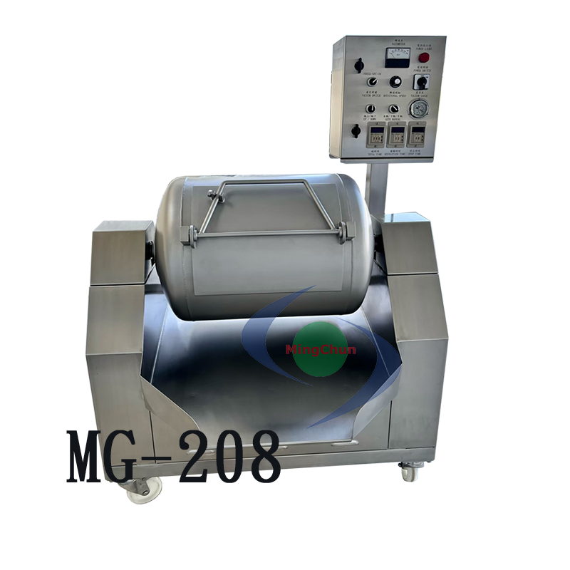 明君機械真空按摩機效防人工,特別使用輕型到中等動態和靜態應用,有效的抗磨損和抗熱性、低壓體滲透率、良好的低溫特性、中等到極端的真空運用,對肉品敲推捏打的原理達到肉類嫩化更有水份及彈性。 在配置生產上,研發真空肉類按摩機取代人工幫肉類達到嫩化將老肉、肉品利用物理衝擊原理,滾揉、摔打及可同時醃漬作用。加工狀態下可達到肉品增量20%,並增加肉品的彈性,提高口感。 在起動加工中可隨意增加各種調味料,經過真空按摩機浸泡加工後,肉品可快速均勻吸收與調味料融合,達到醃漬效果。